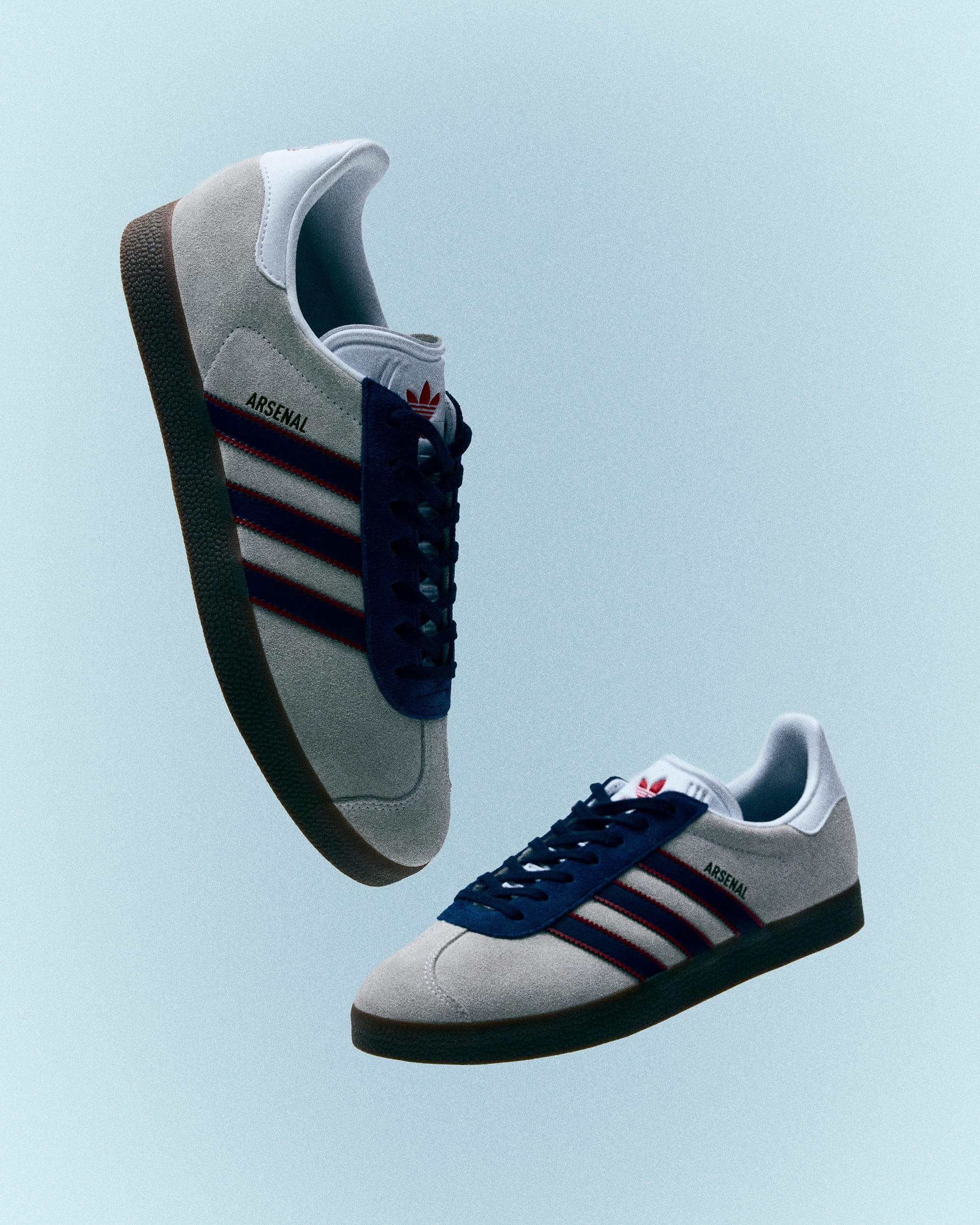 Beyond the jersey, the collection stretches into lifestyle territory with a matching hoodie, track pants, and graphic tee each piece carrying that same retro DNA but cut for modern wardrobes. And then there’s the show-stealer: a special-edition Gazelle sneaker that channels terrace culture in grey suede with red and navy three-stripe detailing and gold Arsenal lettering.