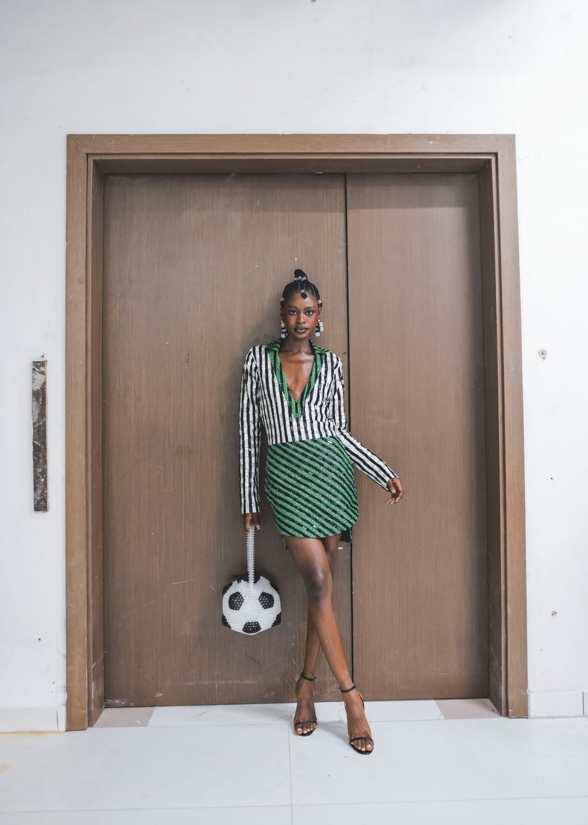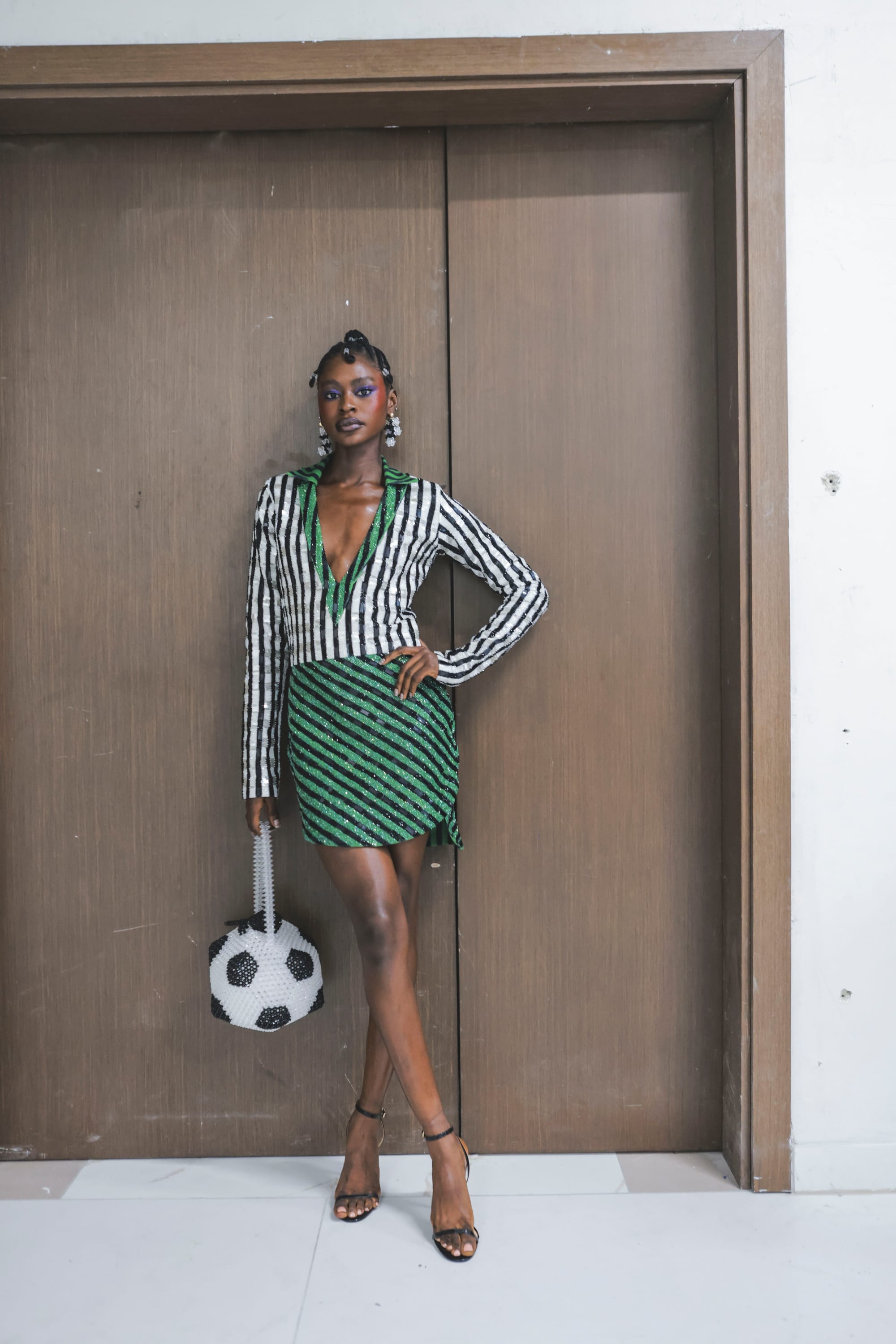 This look opened the show, simply stunning!lovely dress, its striking green-and-white striped pattern, paired perfectly with an accessory that complements the outfit beautifully.