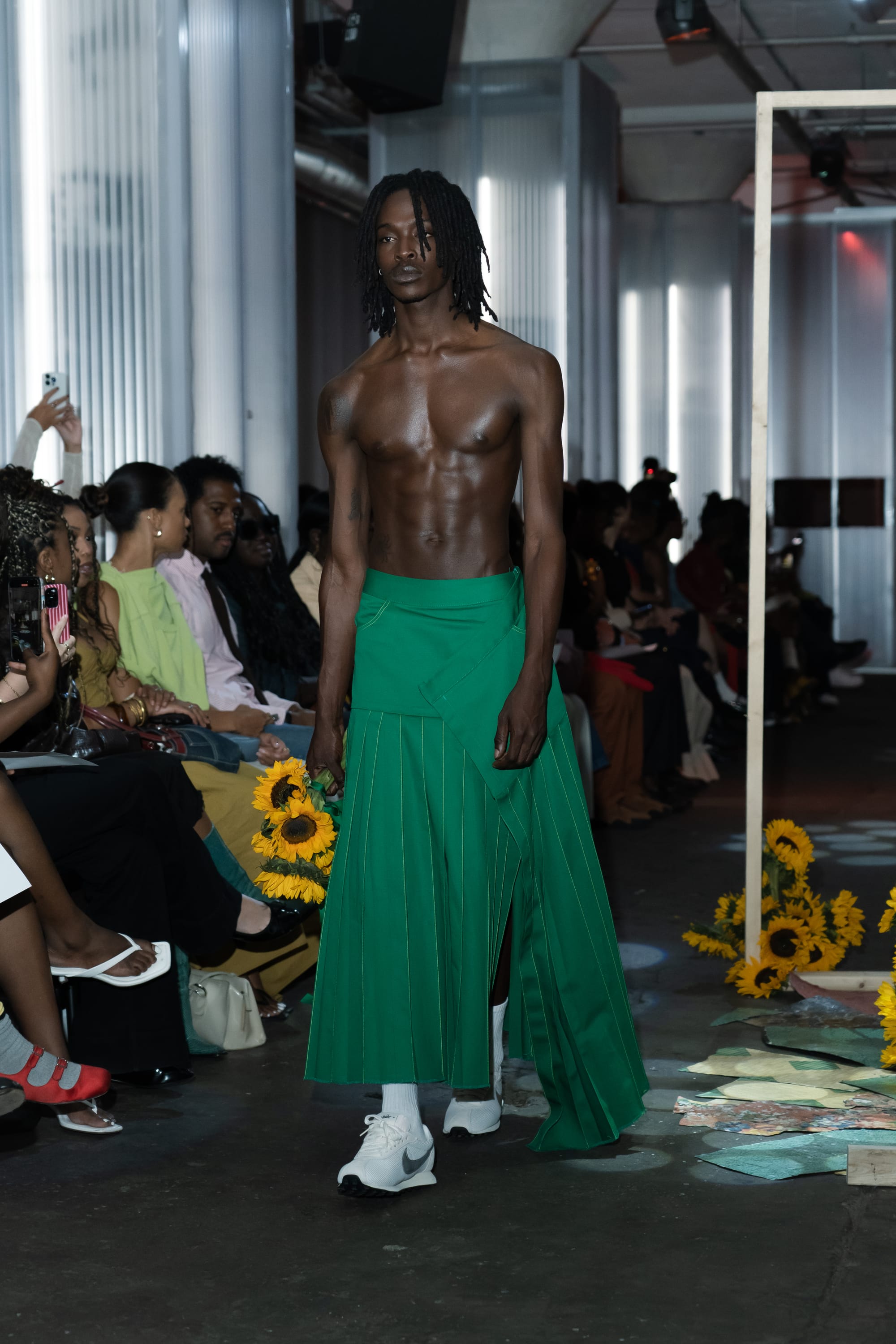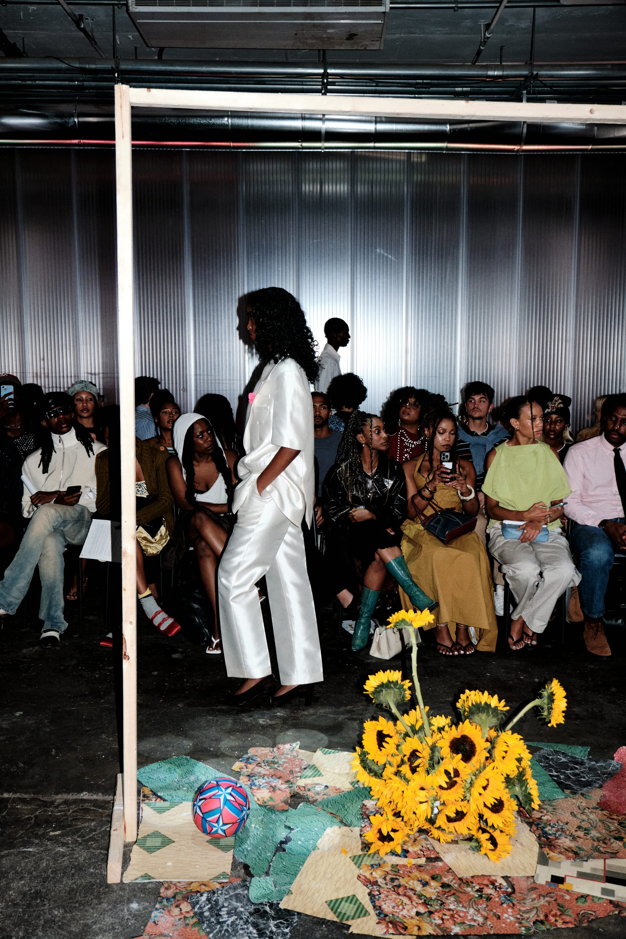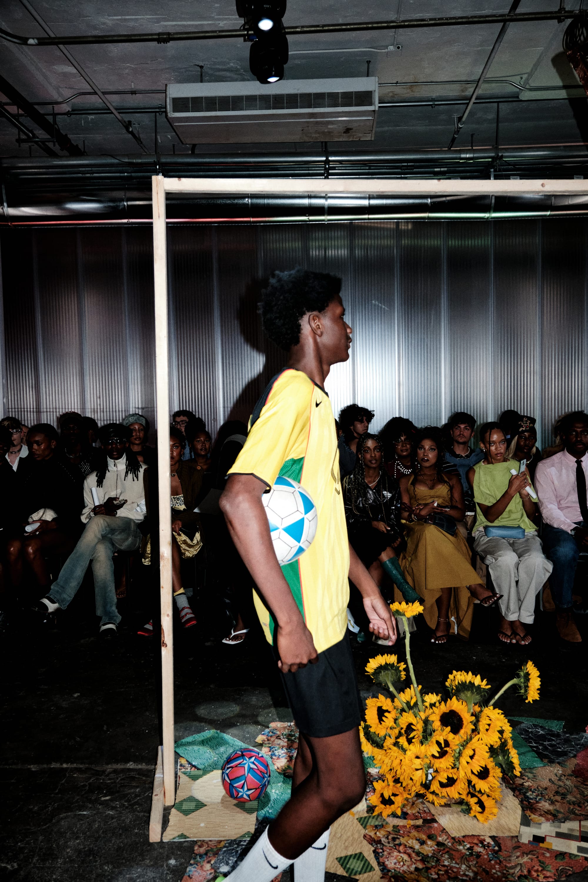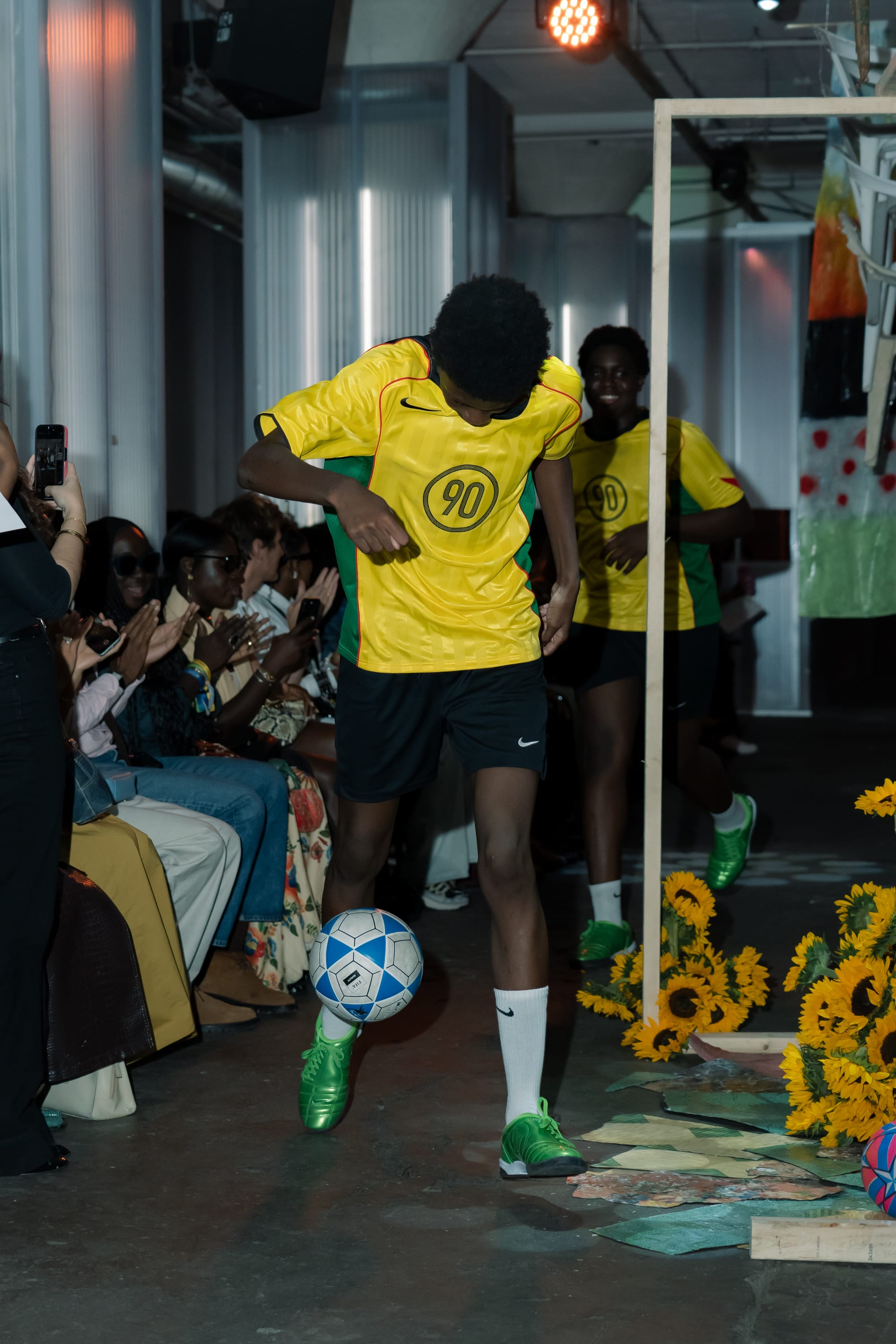 On the runway, players dribbled across the floor in vintage Nike Total 90s, evoking the same mix of joy and competitiveness that marks street matches across West Africa. The gesture brought immediacy to the show: the runway became not just a stage for garments but a pitch where memory, mourning, and play converged.