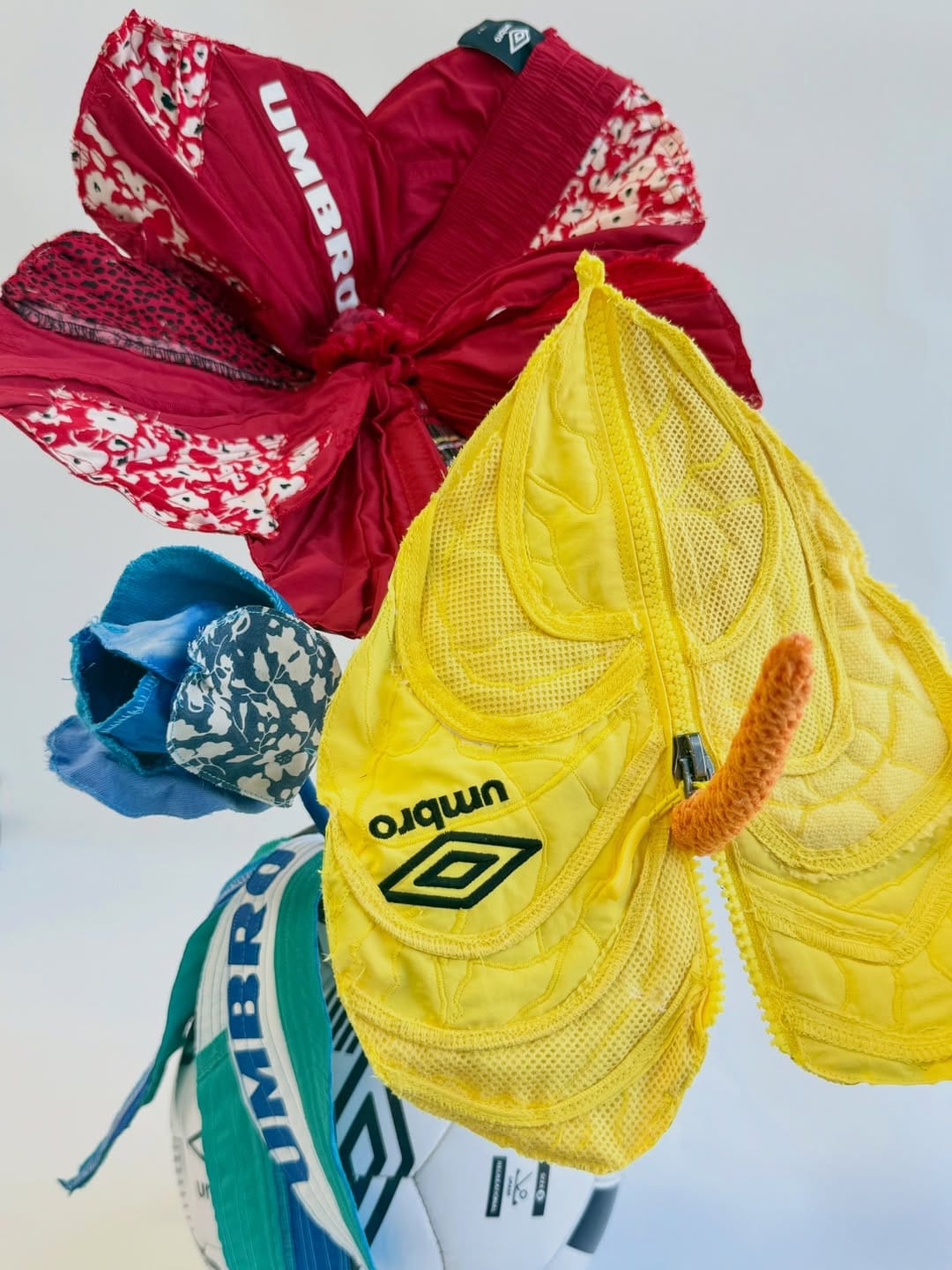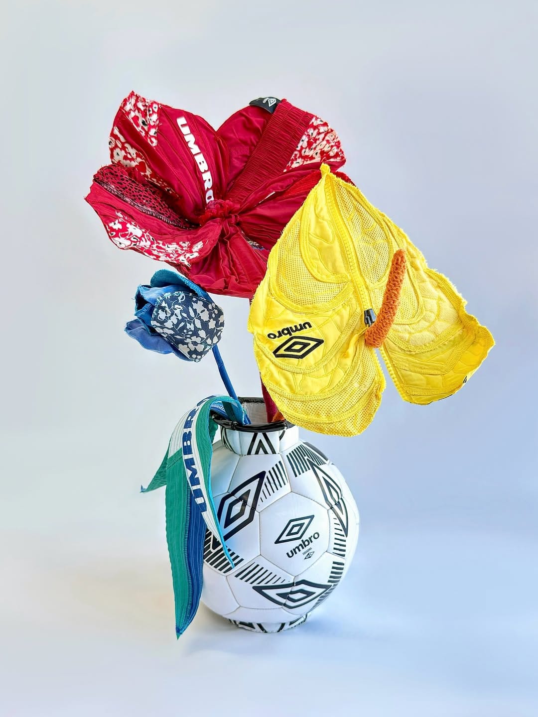 In the attached piece, Umbro bags and apparel are sculpted into Roses & Anthurium flower-like structures, emerging from a football base. It’s striking. Bright colors collide reds, yellows, blues creating something that feels alive, almost growing. What makes this work stand out is its duality. It holds onto the raw energy of football while introducing softness and curiosity. It asks a simple but powerful question: